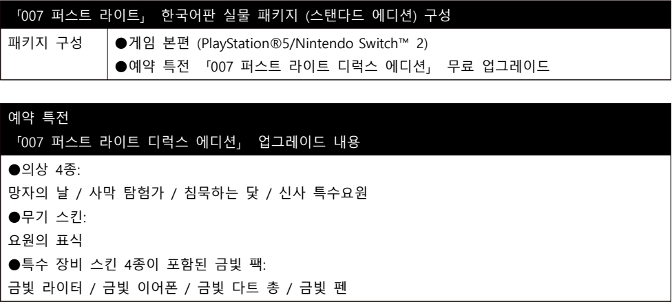 오늘부터 시작하는 예약 판매를 통해 타이틀을 구매하는 경우, 본 타이틀을 디럭스 버전으로 업그레이드할 수 있는 「007 퍼스트 라이트 디럭스 에디션」 콘텐츠가 특전으로 제공된다.